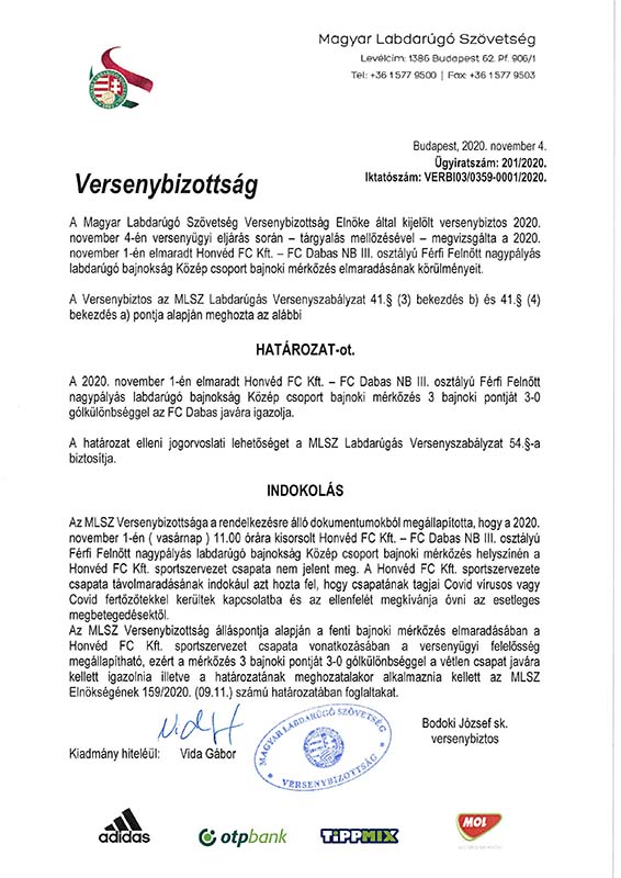 Az MLSZ Versenybizottsága meghozta (201/2020. számú) határozatát az elmaradt Budapest Honvéd-MFA II - FC Dabas (0:3) NB III-as bajnoki mérkőzéssel kapcsolatban. A mérkőzés 3 bajnoki pontját 3:0 gólkülönbséggel az FC Dabas kapja.